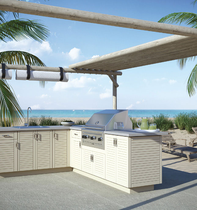 Your inset grill. Those stainless steel drawers. The built-in ice chest and sink. Touched off by the granite or the concrete – your choice – counter space.