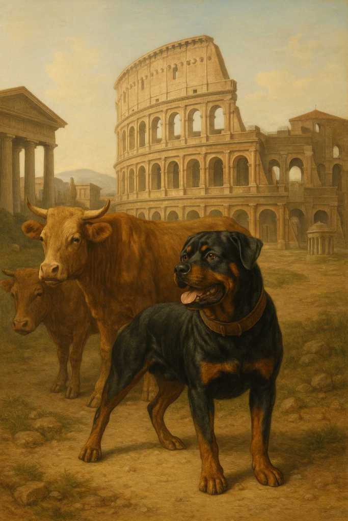 Rottweilers led and protected this vital food source for Romans. Protecting Roman cattle from countryside predators. Predators who would, should they be left unintimidated, thin a herd. A thinned-out herd would lead to a reduced food supply for Roman legions.